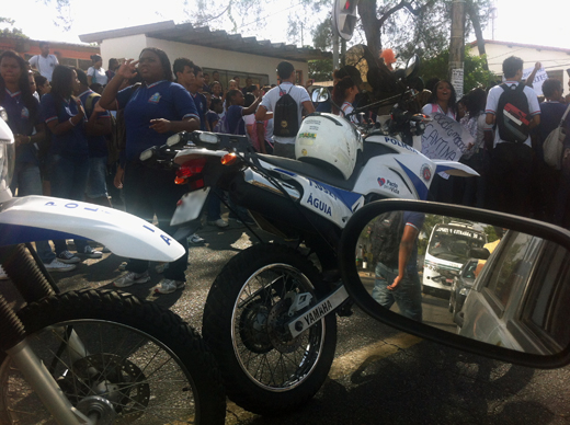 A polícia já está no local, mas o trânsito ainda continua lento na região. Ainda não se sabe o motivo da manifestação, mas uma das alunas estava segurando o cartaz: “Queremos a nossa cantina!”, como podem ver na foto acima.
